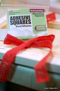 6. Cut a piece of lace trim about 12” long. Tie them into a bow and then adhere the ends on the back of the canvas with Extreme Square.