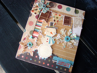 7. Attach a strip of patterned paper and January cardstock sticker to the bottom right corner. Edge plaque with brown ink.
